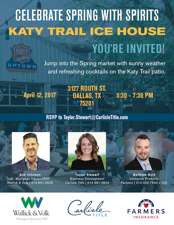 | FREEYou’re invited! Jump into the Spring market with sunny weather and refreshing cocktails on the Katy Trail Ice House patio. RSVP to Taylor Stewart at taylor.stewart@carlisletitle.com.